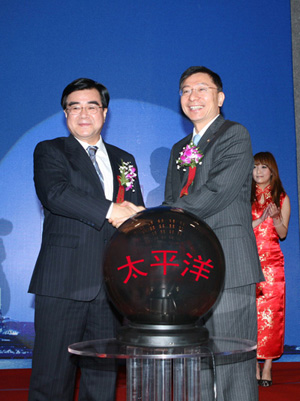 中國保監(jiān)會副主席周延禮(左)、中國太平洋保險集團董事長高國富為中國太平洋保險航運保險事業(yè)總部的成立揭牌。 2009年12月3日,由上海金融服務(wù)辦、上海保監(jiān)局、復(fù)旦大學、中國太平洋保險共同舉辦的航運保險(上海)國際研討會在上海西郊賓館召開。來自中國保監(jiān)會、上海市政府、上海金融辦、上海保監(jiān)局、上海市發(fā)改委、上海市建交委、上海市國稅、地稅局、上海市保險行業(yè)協(xié)會、中國海事仲裁委員會上海分會、中國船級社上海分社、交通運輸部、同業(yè)保險公司、國際再保險公司、銀行、公估行、律師、經(jīng)紀人、航運機構(gòu)、高校、學術(shù)機構(gòu)及太平洋保險等單位150余人參加了會議。