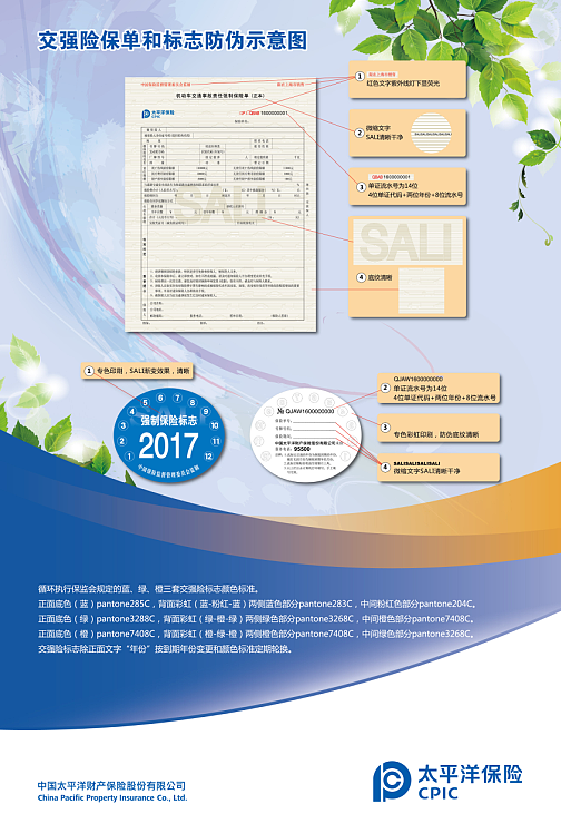 一看,識別單證真偽。要仔細辨別單證是否具有監管要求的防偽技術。一是,交強險單證正本左上角“中國保險監督管理委員會監制”、右上角“限在×××銷售”字樣,并應使用紅色熒光防偽油墨,在紫外燈下發紅色;二是,交強險單證標題下有一條以“SALI”為內容的微縮文字形成的橫線,與標題等長,在5-10倍以上放大鏡下清楚可辨;三是,交強險單證滿版由轎車和貨車圖案做浮雕底紋,中間可見光柵效果的“SALI”四個字母。