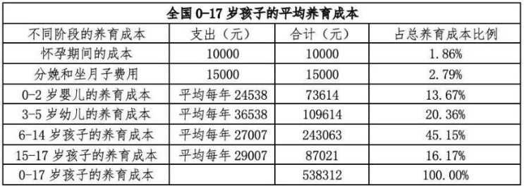據《中國生育成本報告2024版》統計,全國家庭0-17歲孩子的養育成本平均為53.8萬元,而0歲至大學本科畢業的養育成本平均為約68萬元。