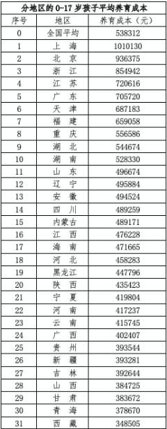 按地區來看,在上海和北京養娃,養育成本甚至分別高達101萬元、93.6萬元!