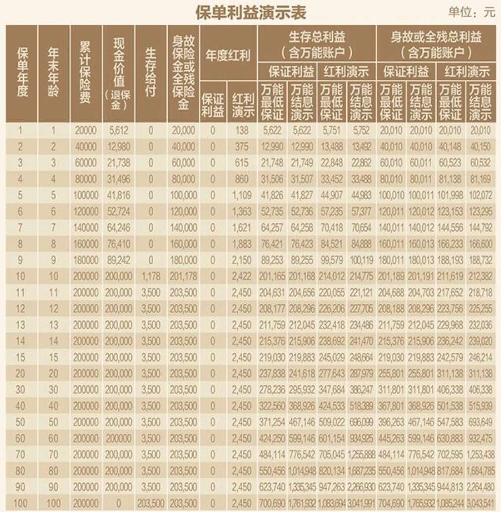 | 保單年度 | 累計保費 | 現(xiàn)金價值 (退保金) | 年度紅利 | 生存總利益(含萬能賬戶) | 身故或全殘總利益(含萬能賬戶) | |||||||