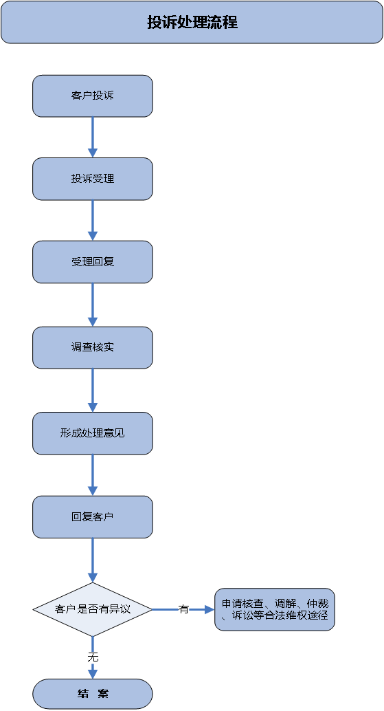 收到投訴之日起1個工作日內受理并聯系客戶,一般案件15日內形成處理意見并回復客戶,復雜案件30日內回復客戶。